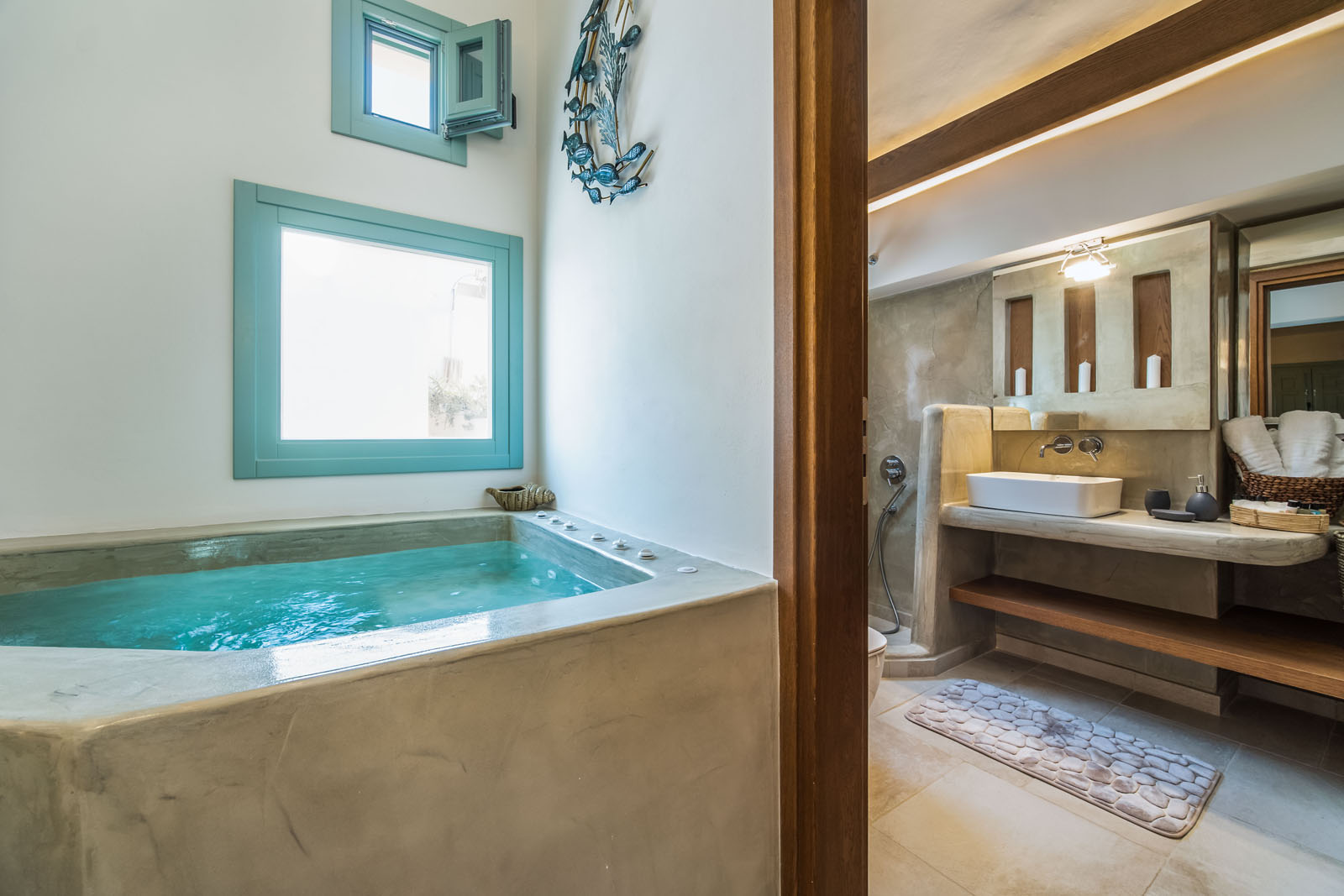 Avra Villa with Prive Jacuzzi, can host up to 4 pax. Inside, there are 2 Double Bedrooms and 2 Bathrooms: 1 with WC and a Shower for 2 & 1 with a WC and a Shower. There is also a Living Room area with a TV, a Dining Table and 1 Kitchen with Sink and a Refrigerator to prepare your snacks. There is also a Private Indoor Jacuzzi Tub to fully enjoy your stay!